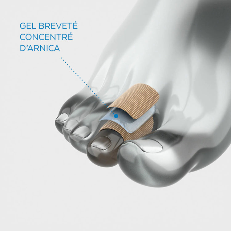 • Le gel breveté concentré à l’Arnica, apporte un confort immédiat à l’orteil pour apaiser, adoucir, purifier et réparer la zone. Il prévient et favorise la disparition des callosités.