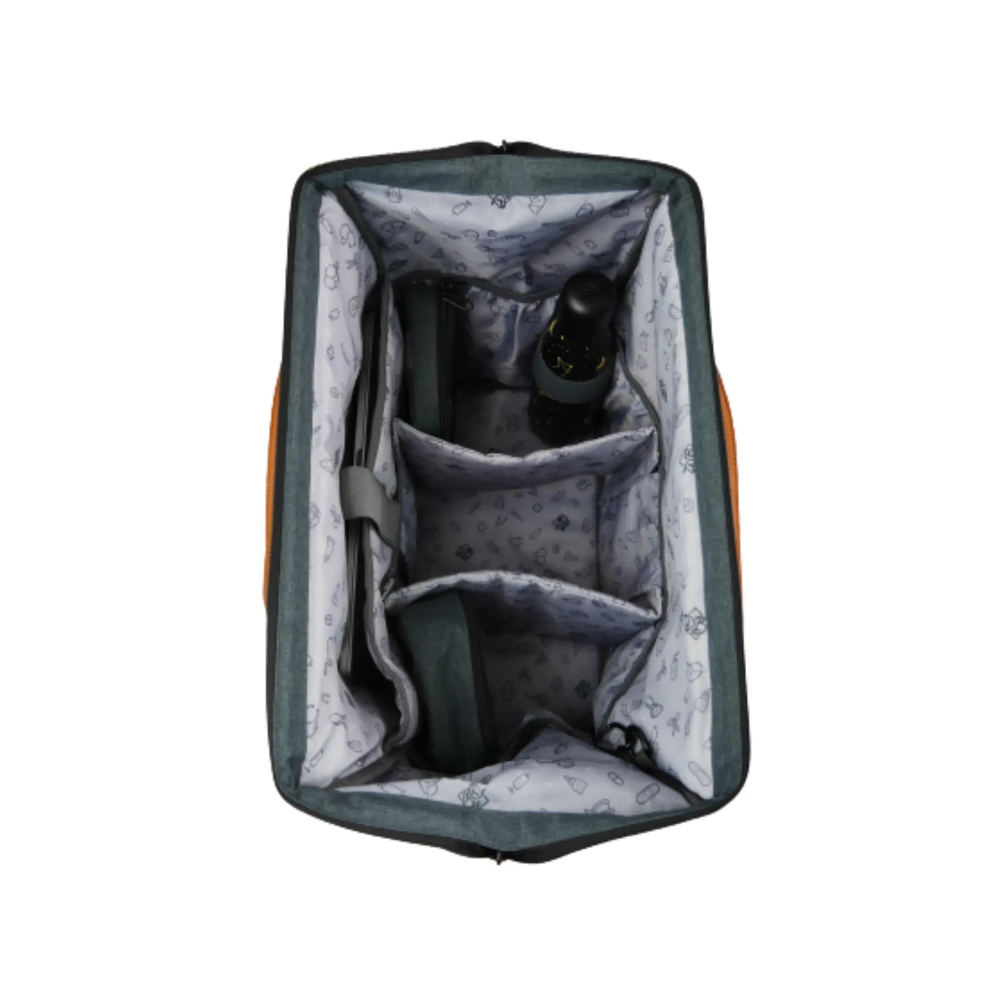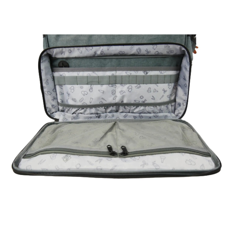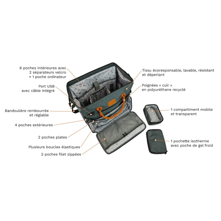 La poche ventrale (40x20 cm) s’ouvre complètement avec d’un côté 2 filets de rangements zippés et 2 poches plates, et sur l’autre face plusieurs boucles élastiques permettent de ranger les petites fournitures de soins : pinces, ciseaux, lampe-stylo, thermomètre, bandages, stylos, etc…
