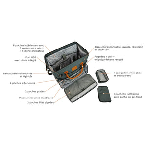 Cet espace comprend aussi 2 compartiments détachables (avec velcro) : 1 transparent pour identifier rapidement le contenu, et 1 isotherme, fourni avec sa poche de gel froid réutilisable, pour y glisser jusqu’à 20 ampoules. Il y a également un mousqueton pour, par exemple, y regrouper les clefs des patients à visiter tous les jours et même une boucle élastique pour maintenir debout une bouteille ou une gourde.